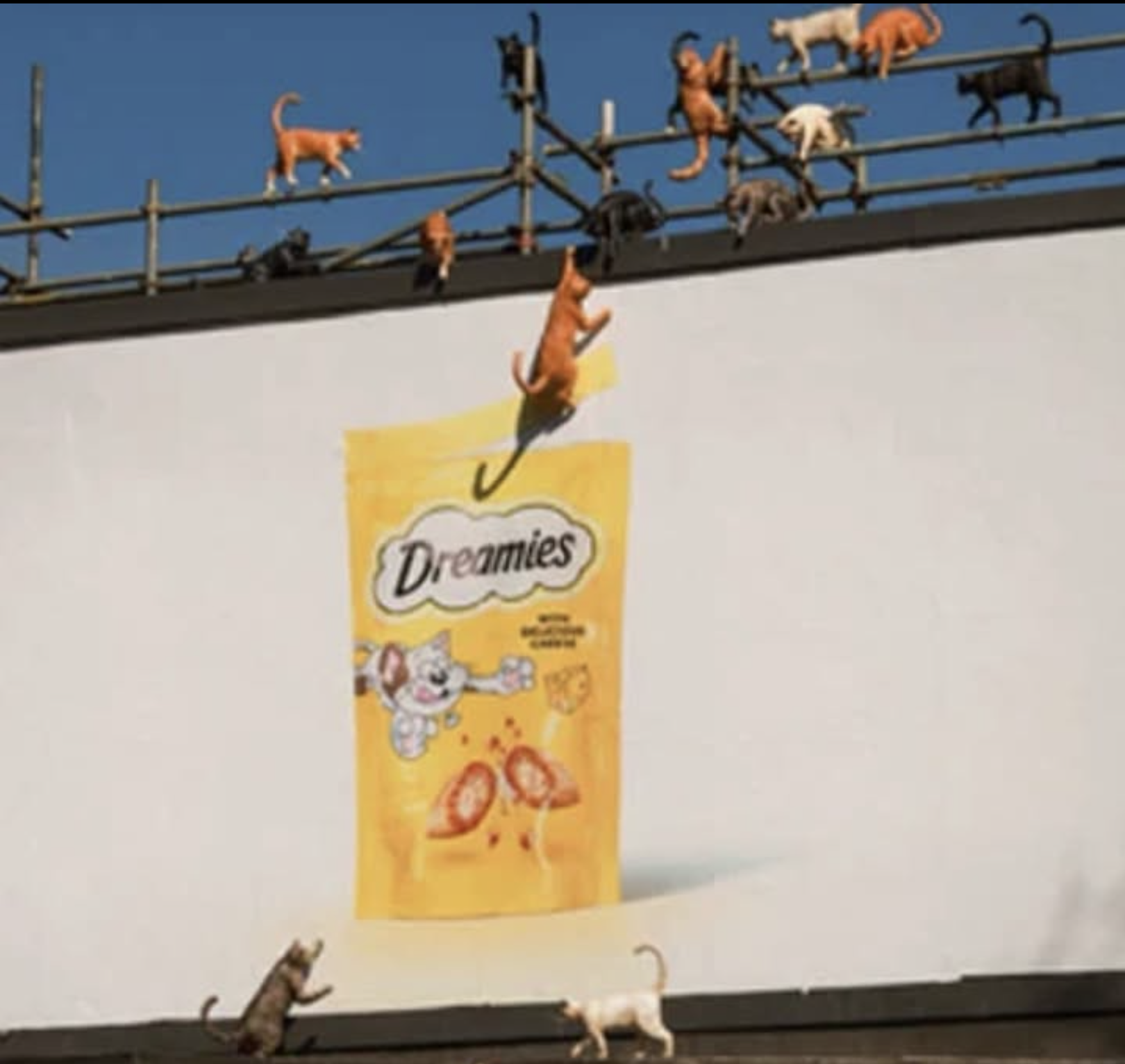 Dreamies 3D printed giant cats climbing a billboard, showcasing the lengths cats will go to for Dreamies.